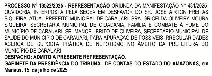 Amazonas – O Tribunal de Contas do Estado do Amazonas (TCE-AM) decidiu admitir uma representação (Processo nº 13522/2025) para apurar possíveis irregularidades na Prefeitura de Carauari, envolvendo membros da própria família do atual prefeito, José Airton Freitas Siqueira (MDB). A investigação decorre de uma manifestação formal enviada à Ouvidoria do TCE, e mira suspeitas de nepotismo e conflitos de interesse na gestão de cargos estratégicos da administração municipal, especialmente nas áreas da saúde e assistência social.