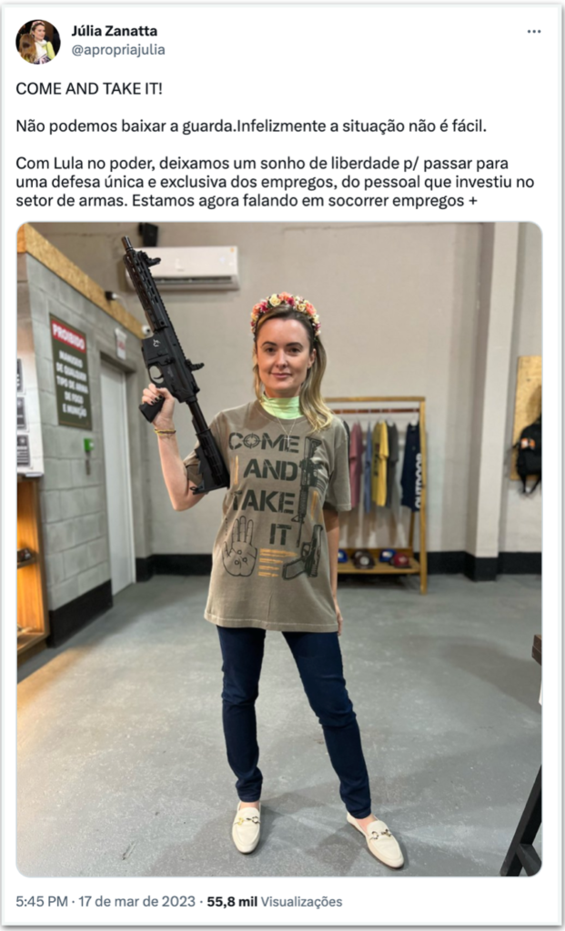 Brasil – A deputada federal Júlia Zanatta (PL-SC) publicou em seu perfil nas redes sociais uma imagem fazendo alusão ao decreto anti-armas instituído pelo novo governo do presidente Luiz Inácio Lula da Silva (PT) enquanto segura uma carabina 9mm. A postagem critica o impacto do decreto sobretudo de famílias que vivem do setor de armas legalizadas, como clubes de tiros e revendedores legalizados.