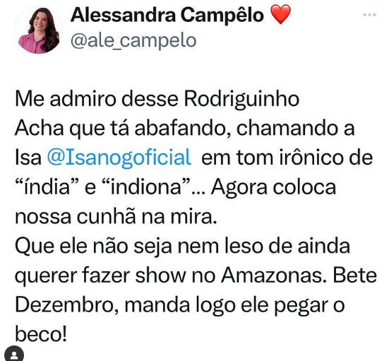 A parlamentar também alertou a empresária Bete Dezembro, conhecida por trazer grandes artistas a Manaus, para não contratar Rodriguinho. “Bete Dezembro, manda logo ele pegar o beco!”, acrescentou Alessandra Campêlo.