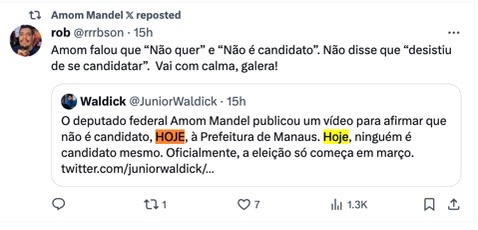 Após Amom receber críticas de que estaria desistindo da disputa à prefeitura, o deputado federal repostou uma observação de um seguidor sobre a semântica do ele realmente teria dito: “Amom não é candidato, HOJE, à Prefeitura de Manaus. Hoje, ninguém é candidato mesmo. Oficialmente, a eleição só começa em março”, diz o perfil.
