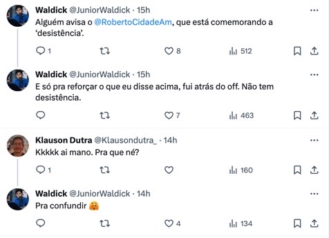 “Só pra deixar claro, nunca saiu da minha boca a frase “eu desisto”, apesar das manchetes. Nunca desisto de nenhum desafio que eu decido tentar. Boa noite a todos!. “É impossível “desistir” do que nunca declarei oficialmente que queria. Simplesmente disse que meu objetivo é terminar o que comecei. Eu sou guiado pela vontade de fazer o melhor para a minha cidade e para o meu Estado. Quanto sensacionalismo desses perfis”.