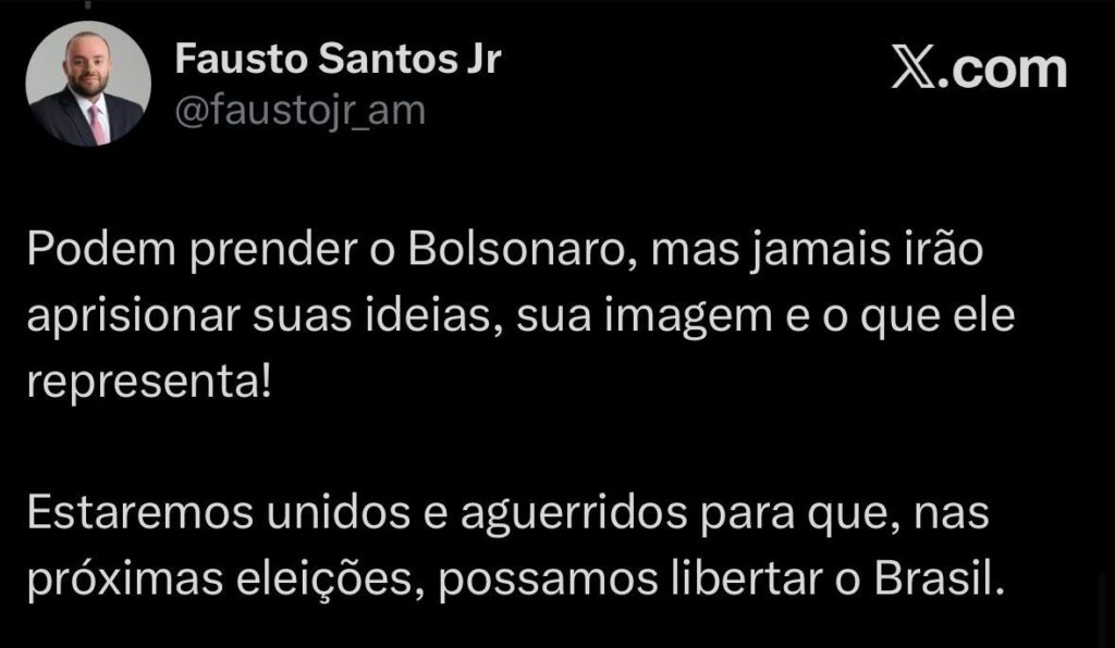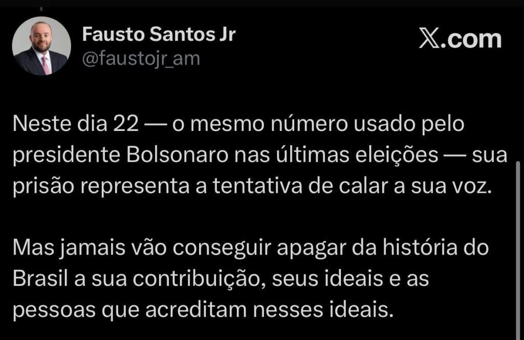 Fausto Jr. também chamou atenção para a data da prisão — 22 de novembro — número que, segundo ele, remete ao 22 utilizado por Bolsonaro nas eleições, o que simbolizaria uma tentativa de “calar sua voz”. O parlamentar reforçou que, apesar da detenção, o legado político do ex-presidente e sua influência entre os apoiadores seguem intactos.
