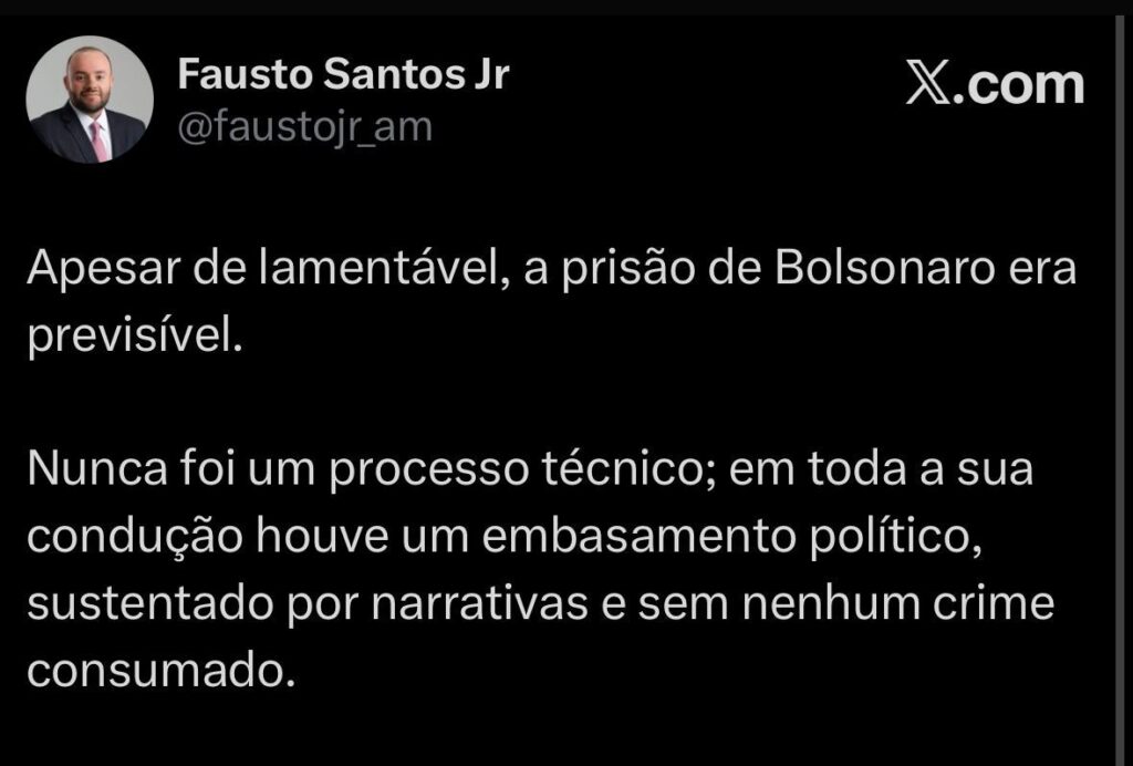 Brasil – O deputado federal Fausto Jr. se manifestou neste sábado (22/11) sobre a prisão do ex-presidente Jair Bolsonaro, realizada pela Polícia Federal nas primeiras horas da manhã. Em nota oficial, o parlamentar classificou a detenção como “previsível” e afirmou que a decisão teria motivação política, e não técnica.