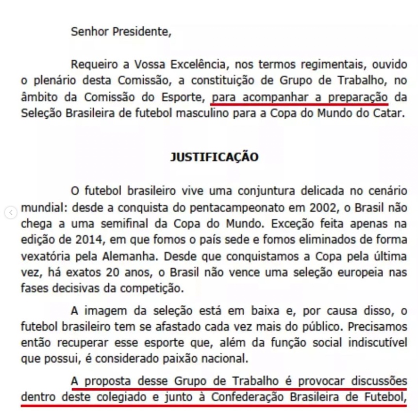 Pablo disse que a Comissão de Esportes criou um grupo de trabalho para “acompanhar a preparação da Seleção Brasileira”, mas em nenhum momento foi discutido que o grupo viaje ao Quatar, nos Emirados Árabes.