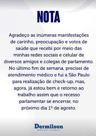 Nas redes sociais, a assessoria do parlamentar publicou um pedido de agradecimento às mensagens de apoio, e fontes da Assembleia Legislativa do Amazonas (Aleam) também confirmaram que a cirurgia foi um sucesso e que Dermilson Chagas passa bem.