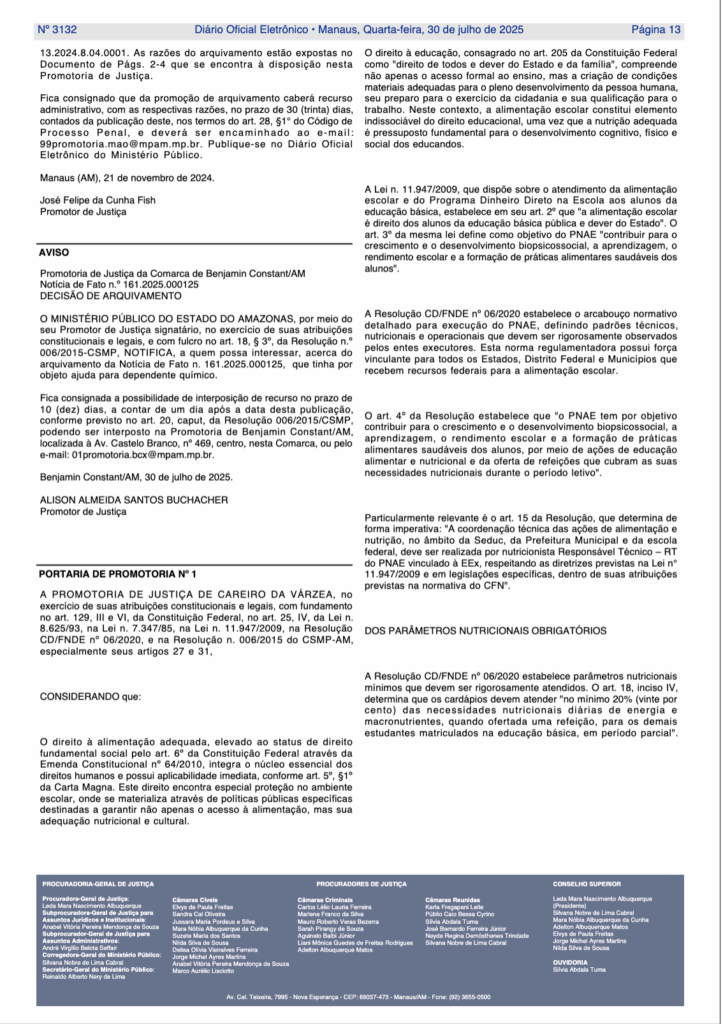 Diante da situação, o MPAM determinou que o município providencie imediatamente um nutricionista responsável e apresente um plano de ação com cardápios nutricionalmente adequados, incluindo informações sobre qualidade, periodicidade e controle dos alimentos servidos nas escolas.