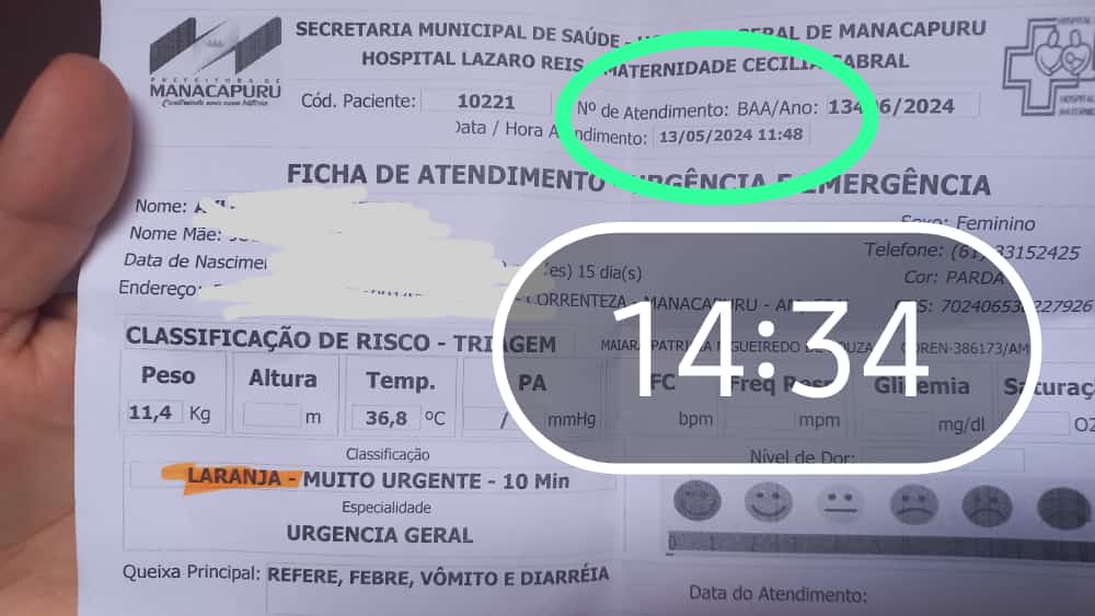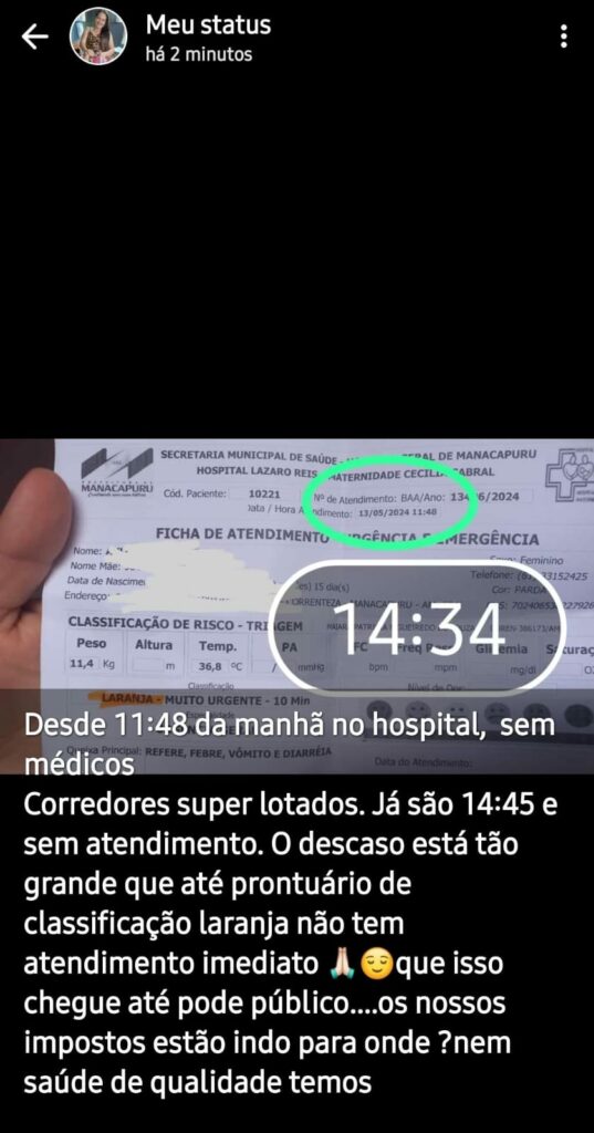 Amazonas – Mais uma vez, o município de Manacapuru, no Amazonas, se vê diante de graves denúncias sobre o descaso nos serviços públicos de saúde. Uma paciente, que chegou ao Hospital Lázaro Reis e Maternidade Cecília Cabral às 11h48 desta segunda-feira (13), relatou que só foi atendida após mais de duas horas de espera, por volta das 14h35.