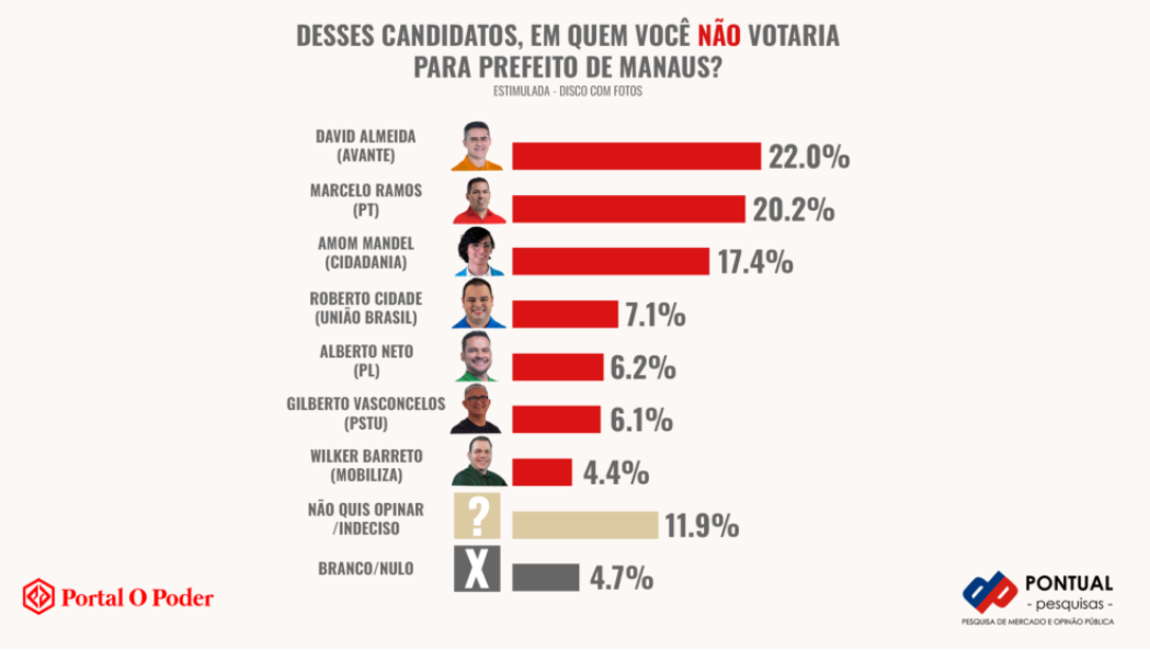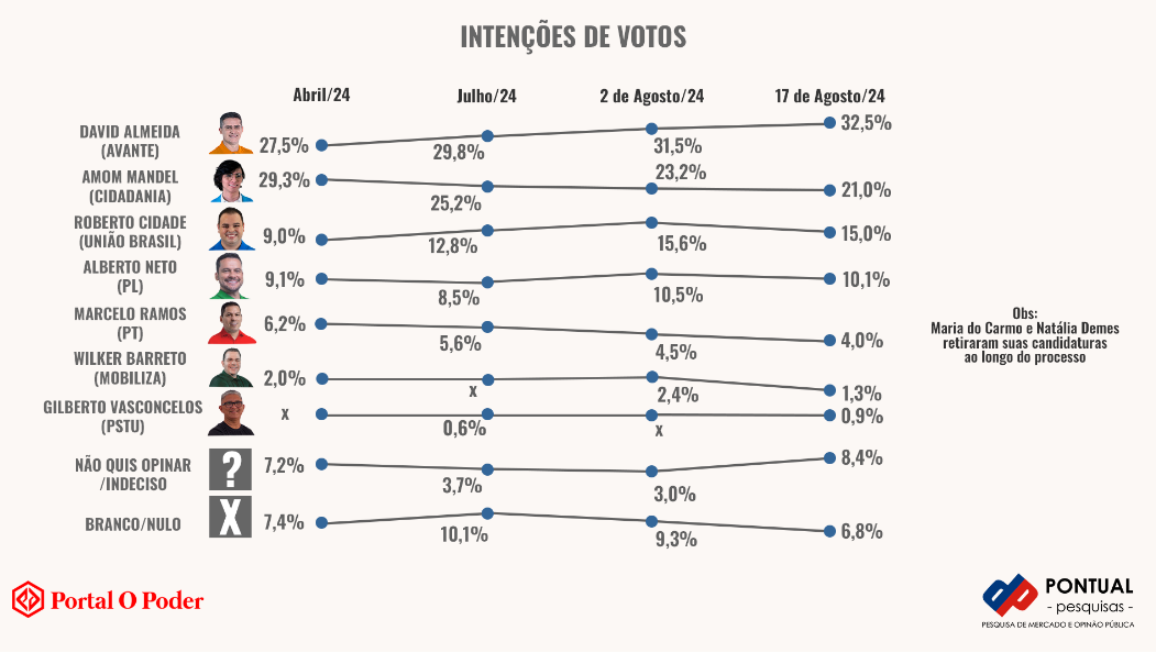 No topo da corrida está David Almeida, atual prefeito e candidato do Avante. Almeida continua a expandir seu apoio, partindo de 27,5% em abril para 32,5% na pesquisa atual. Após um crescimento contínuo – 29,8% em julho e 31,5% no início de agosto – Almeida solidifica sua posição como líder na corrida pela reeleição.
