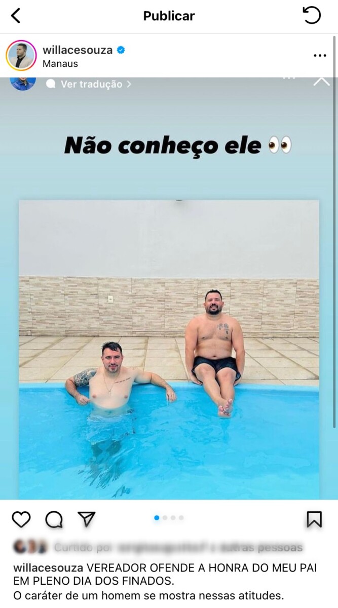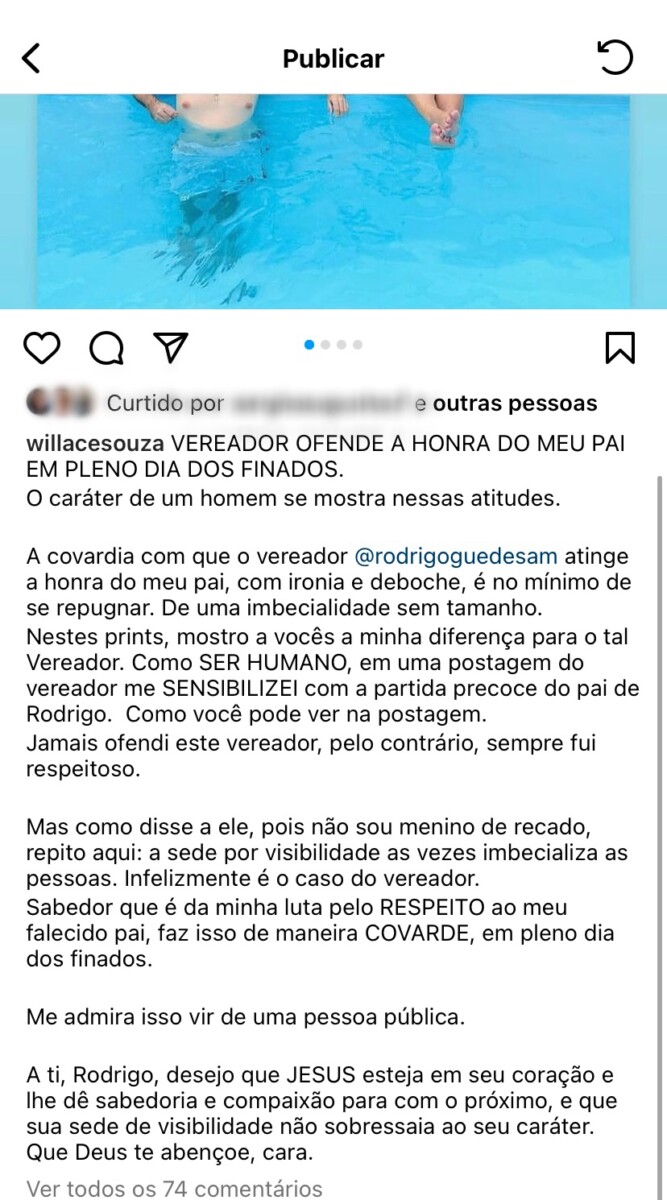 “A covardia com que o vereador @rodrigoguedesam atinge a honra do meu pai, com ironia e deboche, é no mínimo de se repugnar. De uma imbecilidade sem tamanho”, escreveu Willace. Com a repercussão negativa da publicação Rodrigo Guedes resolveu apagar.