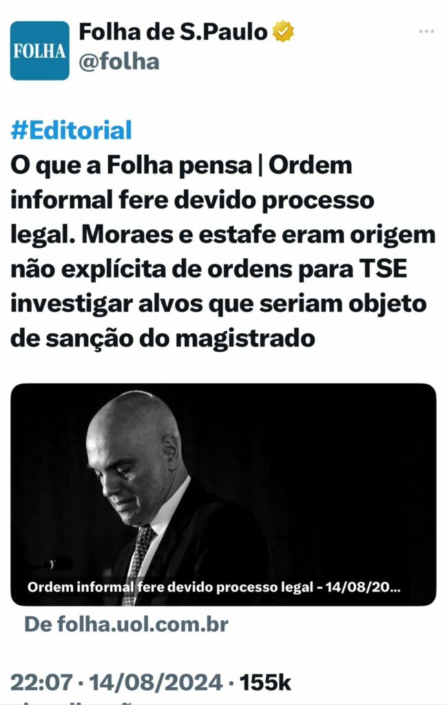 Brasil – Em um editorial publicado na noite de 14 de agosto de 2024, a Folha de S.Paulo expôs uma crítica contundente à atuação do Ministro Alexandre de Moraes e de sua equipe, destacando a prática de emitir ordens informais para o Tribunal Superior Eleitoral (TSE) investigar determinados alvos, sem o devido processo legal. Segundo o editorial, essa abordagem coloca em risco a integridade das investigações e do próprio sistema jurídico brasileiro.