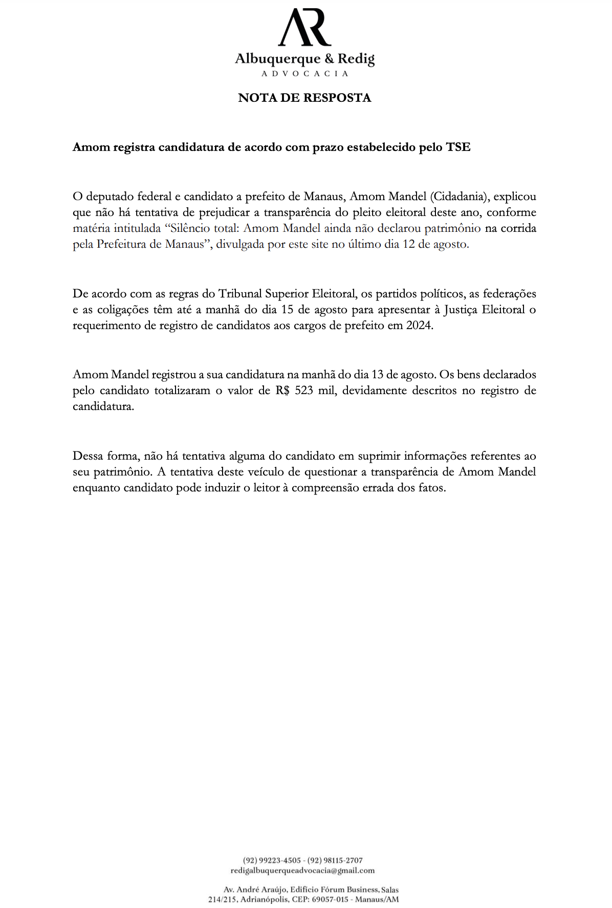 “O deputado federal e candidato a prefeito de Manaus, Amom Mandel (Cidadania), explicou que não há tentativa de prejudicar a transparência do pleito eleitoral deste ano, conforme matéria intitulada “Silêncio total: Amom Mandel ainda não declarou patrimônio na corrida pela Prefeitura de Manaus”, divulgada por este site no último dia 12 de agosto.