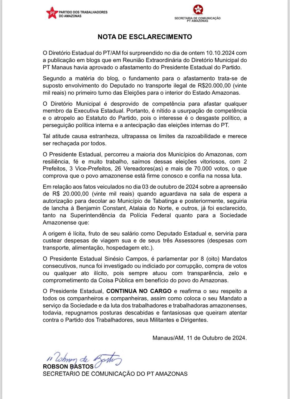 Manaus – O Diretório Estadual do Partido dos Trabalhadores (PT) do Amazonas emitiu uma nota oficial em resposta a rumores sobre o afastamento do presidente estadual, Sinésio Campos. A polêmica surgiu após a divulgação em blogs, que afirmavam que a Reunião Extraordinária do Diretório Municipal do PT Manaus teria aprovado o afastamento do líder.