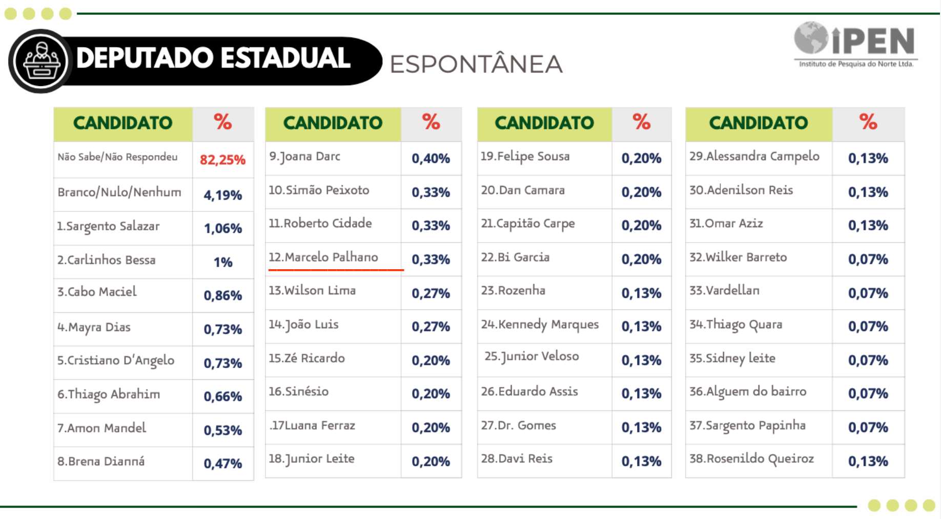 Amazonas – O vice-prefeito de Presidente Figueiredo, Marcelo Palhano, deu um salto inesperado — e altamente significativo — no tabuleiro político amazonense. Em um cenário marcado por disputas acirradas, forte presença de nomes tradicionais e um eleitorado cada vez mais exigente, Palhano apareceu em 12º lugar nas intenções espontâneas de voto para deputado estadual em uma recente pesquisa realizada pelo IPENG6, consórcio formado por BNC Amazonas, Amazonas Atual, Portal Único, Portal do Marcos Santos, Portal do Mário Adolfo e Blog do Hiel Levy.