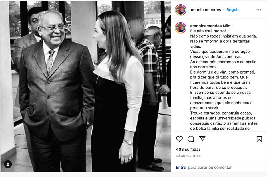 No postagem de Mônica, o texto de Lívia cita que Amazonino não deixou nada por fazer, nada por viver e que teve uma vida extraordinária para um caboclo do interior.
