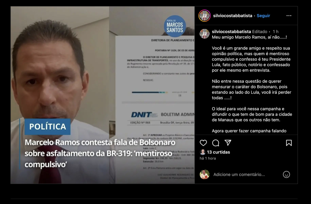 Silvio fez referência a fala de Ramos sobre Bolsonaro ter asfaltado parte da BR-319. No seu discurso, o ex-deputado chamou o ex-presidente de mentiroso compulsivo. “Vocês assistiram no vídeo o ex-presidente inelegível dizer que ele iniciou o asfaltamento da BR-319 e que essa obra foi paralisada durante o governo Lula por uma intervenção da ministra Marina Silva. Bolsonaro mente, é um mentiroso doentio e compulsivo”, enfatizou.