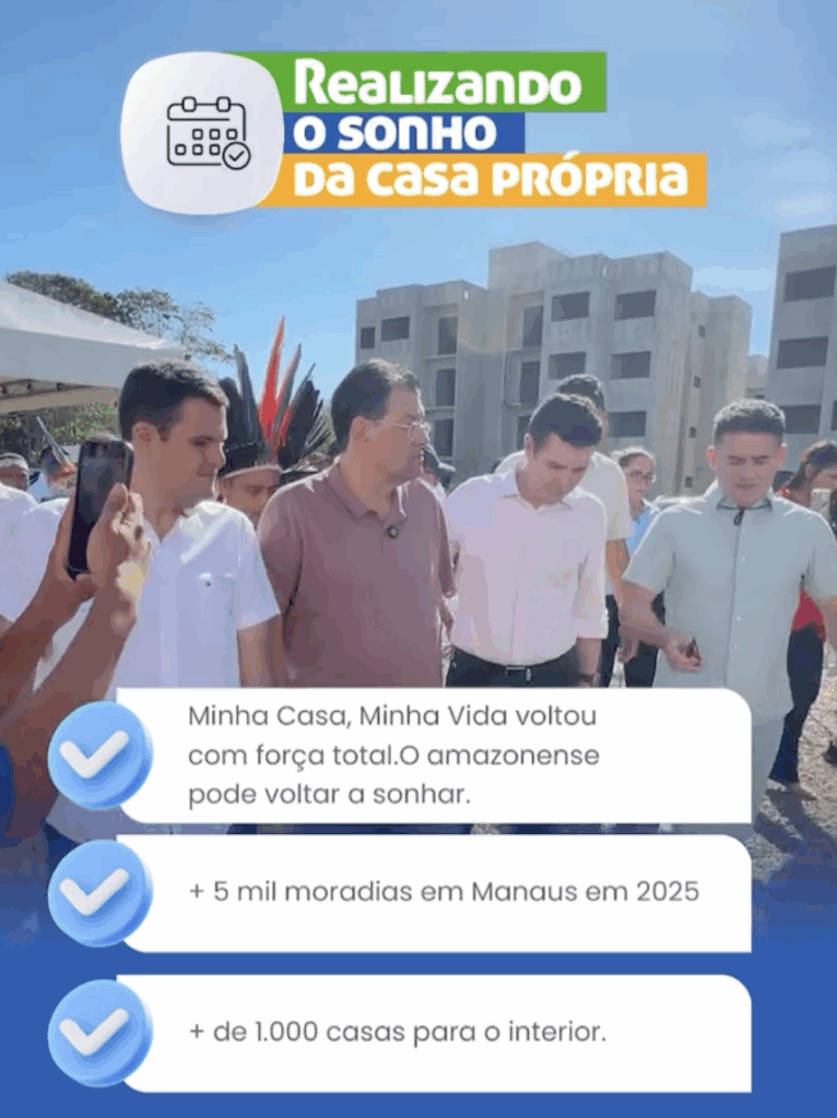 O programa Minha Casa Minha Vida também ganhou novo fôlego no Amazonas graças à articulação do parlamentar. Por meio de emendas e apoio técnico, Eduardo Braga garantiu a retomada de projetos habitacionais em municípios estratégicos como Parintins, Itacoatiara e Tabatinga, contribuindo para a redução do déficit habitacional no estado.