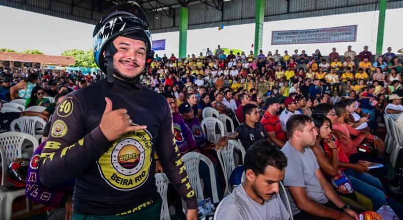 Durante a entrega dos 1.000 coletes e capacetes para mototaxistas, ao lado da prefeita Valciléia Maciel, o senador reforçou a importância de ações para segurança no trânsito e valorização dos profissionais de transporte.
