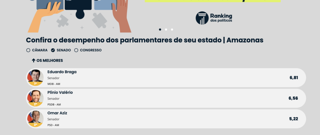 O ranking também aponta o senador Omar Aziz (PSD) na terceira colocação, com nota 5,22, resultado que coloca Omar entre os parlamentares do estado com pior desempenho na avaliação do Ranking dos Políticos, que considera critérios como presença em votações, qualidade legislativa e alinhamento com indicadores adotados pela plataforma.