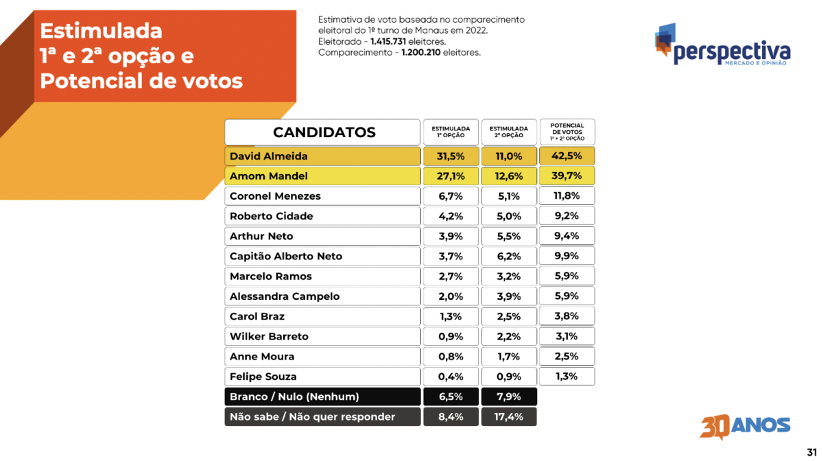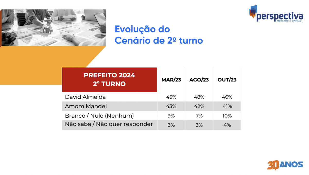 A pesquisa também realizou simulações de segundo turno entre os líderes da corrida eleitoral, indicando que, caso acontecesse um segundo turno hoje, David Almeida venceria Amom Mandel com 46% contra 41%.