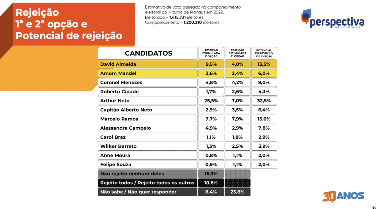 No que diz respeito à rejeição dos principais candidatos, tanto David quanto Amom têm índices baixos. Amom, que é novo na política, possui uma rejeição de 3,6%, enquanto David, com uma longa trajetória política de mais de 20 anos, registra uma rejeição de 9,5%.