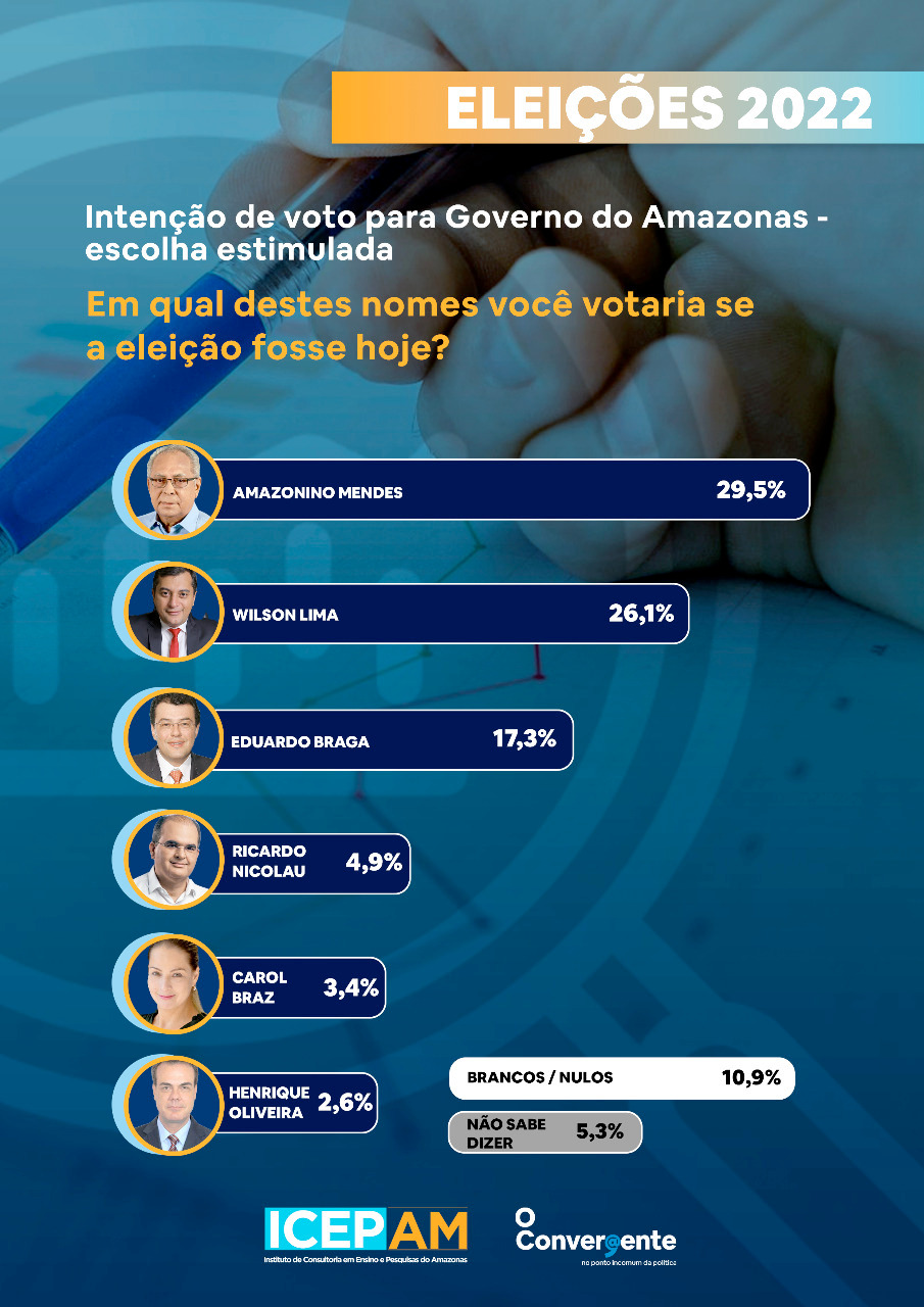 Manaus – Nesta sexta-feira (03) o Instituto de Consultoria em Ensino e Pesquisa do Amazonas (ICEPAM), divulgou as intenções de voto para o Governo do Amazonas. A pesquisa aponta que Amazonino Mendes lidera no primeiro turno com 29,5%, e o governador Wilson Lima ocupa o segundo lugar, com 26,1% dos votos.