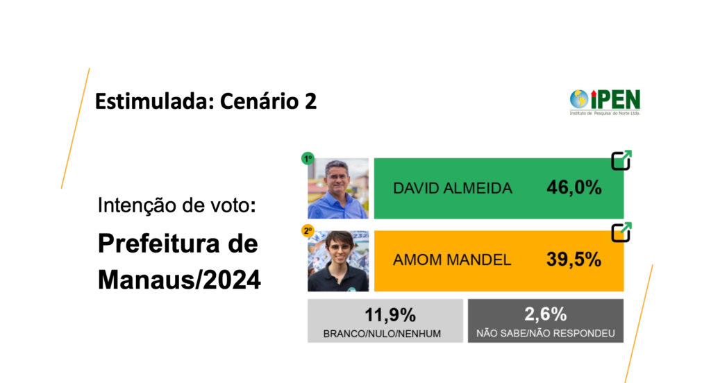 Conforme a pesquisa IPEN, David venceria com 46% dos votos se seu adversário fosse Amom, com 39,5%.