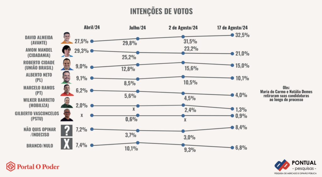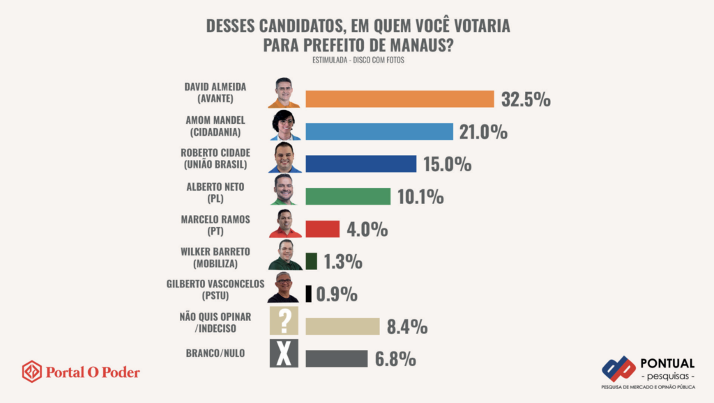 O atual prefeito David Almeida (Avante) aparece liderando a disputa com 32,5% das intenções de votos, consolidando sua posição como favorito na corrida eleitoral. O deputado federal Amom Mandel (Cidadania) segue na segunda posição, com 21% dos votos. A disputa pelo terceiro lugar está acirrada entre o deputado estadual Roberto Cidade (UB), que obteve 15%, e o deputado federal Alberto Neto (PL), com 10,1%.