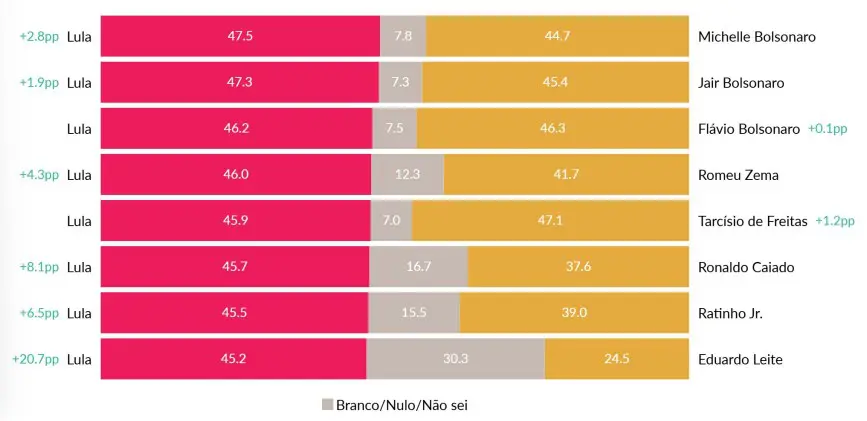 O levantamento testou outros grandes nomes da direita e centro-direita contra o petista, incluindo Jair Bolsonaro, Michelle Bolsonaro, Tarcísio de Freitas, Romeu Zema, Ronaldo Caiado, Ratinho Júnior e Eduardo Leite. No entanto, Flávio Bolsonaro foi o único candidato a conseguir superar numericamente o atual presidente nesta rodada de simulações.