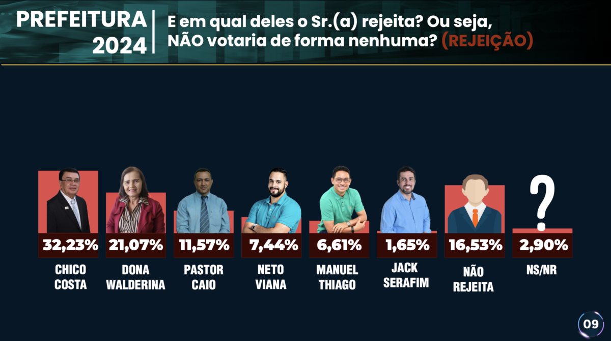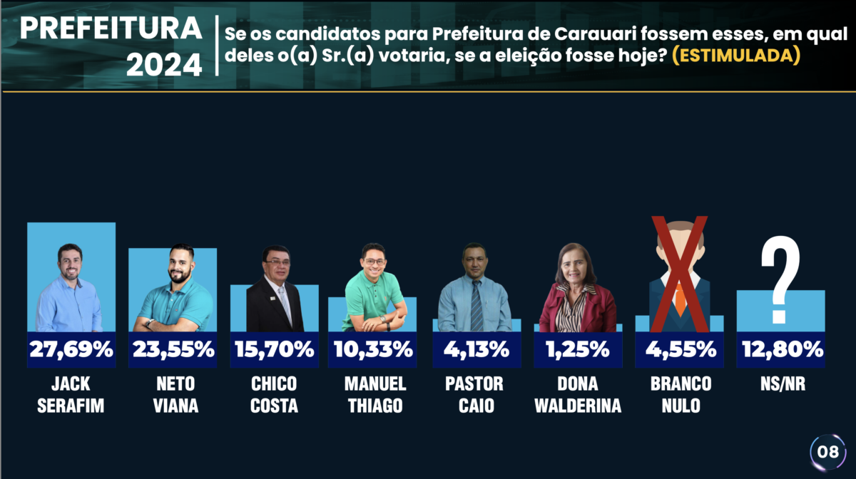 Outro ponto em favor do comunicador e cientista político é a baixa rejeição, a menor entre os sete nomes consultados entre a população de Carauari: 1,65%. Este índice aponta que há uma larga margem para crescimento em comparação a outros candidatos.