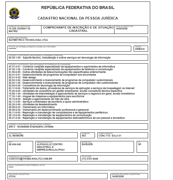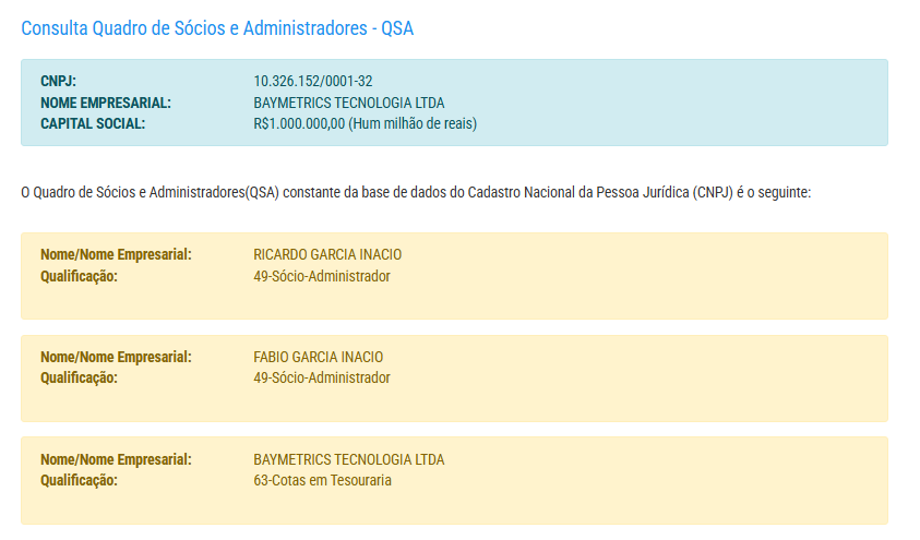 A empresa Baymetrics Tecnologia Ltda, inscrita no CNPJ 10.326.152/0001-32, atua no setor de suporte técnico e manutenção em tecnologia da informação. Seu capital social declarado é de R$ 1 milhão, e os sócios são Ricardo Garcia Inácio e Fabio Garcia Inácio.