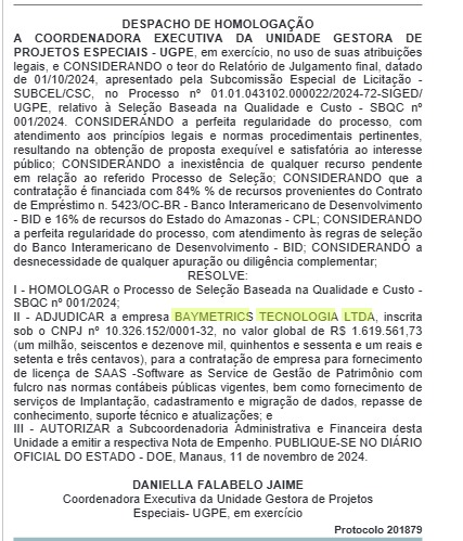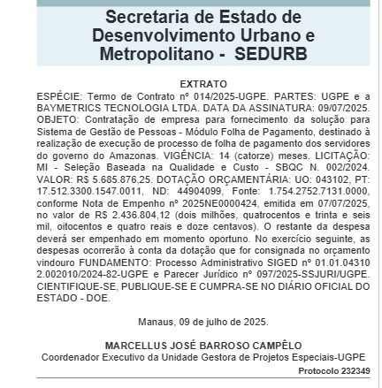Amazonas – O Governo do Amazonas firmou um novo contrato milionário com a empresa paulista Baymetrics Tecnologia Ltda, desta vez no valor de R$ 5,6 milhões, para a execução da folha de pagamento dos servidores estaduais. A contratação foi realizada pela Secretaria de Estado de Desenvolvimento Urbano e Metropolitano (Sedurb), sob o comando de Marcellus Campêlo, considerado um dos principais aliados políticos do governador Wilson Lima (União Brasil).