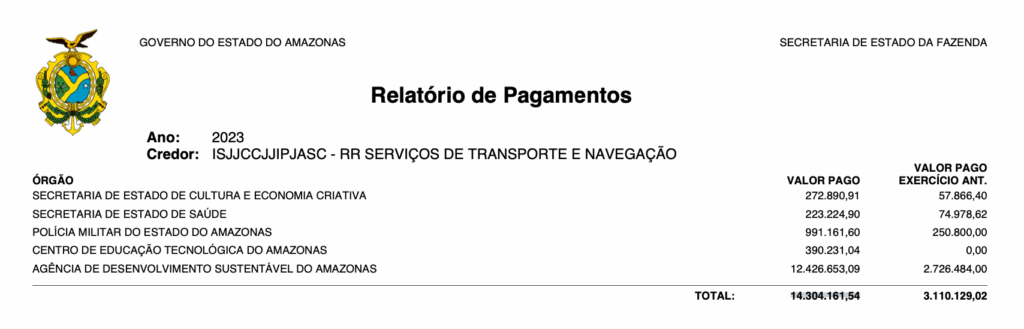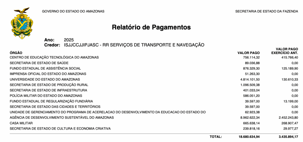 Mais recentemente, a R R Serviços de Transporte voltou a aparecer no Diário Oficial, desta vez como vencedora do Pregão Eletrônico nº 014/2025 da Agência Amazonense de Desenvolvimento Econômico, Social e Ambiental (Aadesam). A empresa levou os Lotes I, II e III por R$ 20.708.798,40, destinados à locação de veículos automotores.