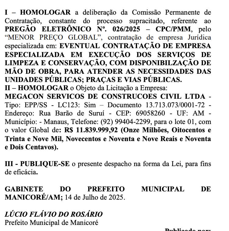 Segundo os documentos enviados à nossa redação, a gestão municipal homologou a deliberação da Comissão Permanente de Contratação, constante no Pregão Eletrônico Nº 026/2025, que prevê a eventual contratação de uma empresa especializada na execução de serviços de limpeza, conservação e disponibilização de mão de obra para atuar em unidades públicas, praças e vias públicas de Manicoré.
