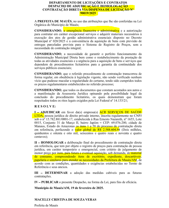 Amazonas – A Prefeitura de Maués, no Amazonas, firmou um contrato de R$ 2.588.604,94 com a empresa ACR Serviços de Saúde Ltda para aquisição de materiais de expediente, incluindo papel, canetas, alfinetes, blocos de anotação, apagadores e outros itens de papelaria. O contrato, firmado sob a gestão da prefeita Macelly Veras (PDT), chama atenção tanto pelo volume de produtos quanto pela natureza da empresa contratada, especializada em serviços de saúde, não em fornecimento de material administrativo.