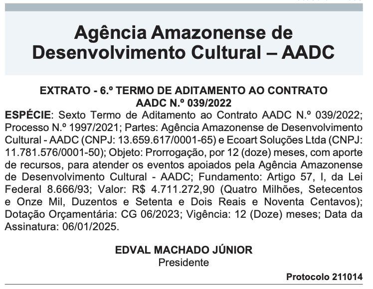 O 6º Termo de Aditamento ao Contrato AADC nº 039/2022, publicado pela Agência Amazonense de Desenvolvimento Cultural (AADC), prorrogou por mais 12 meses o acordo com a Ecoart, incluindo aporte de recursos no valor de R$ 4.711.272,90 para atender eventos apoiados pelo órgão ao longo de 2025. O documento foi assinado em 6 de janeiro por Edval Machado Júnior, presidente da AADC.