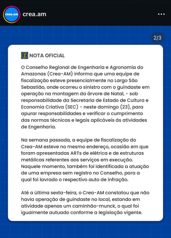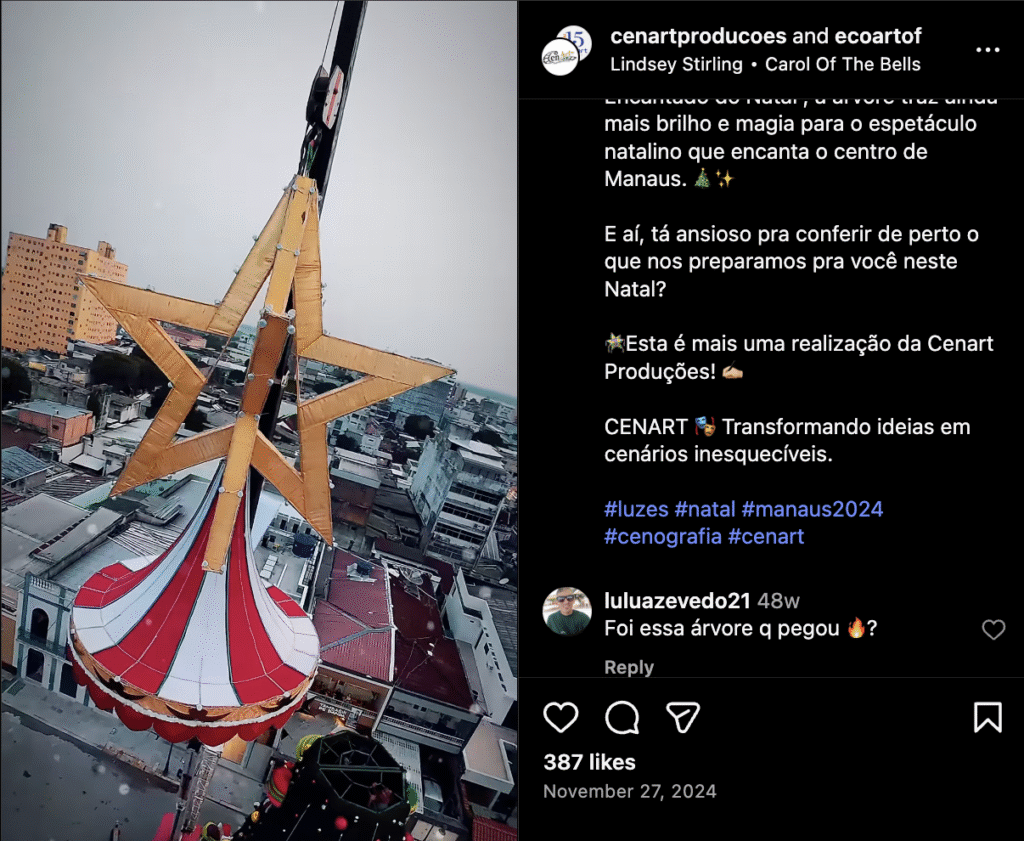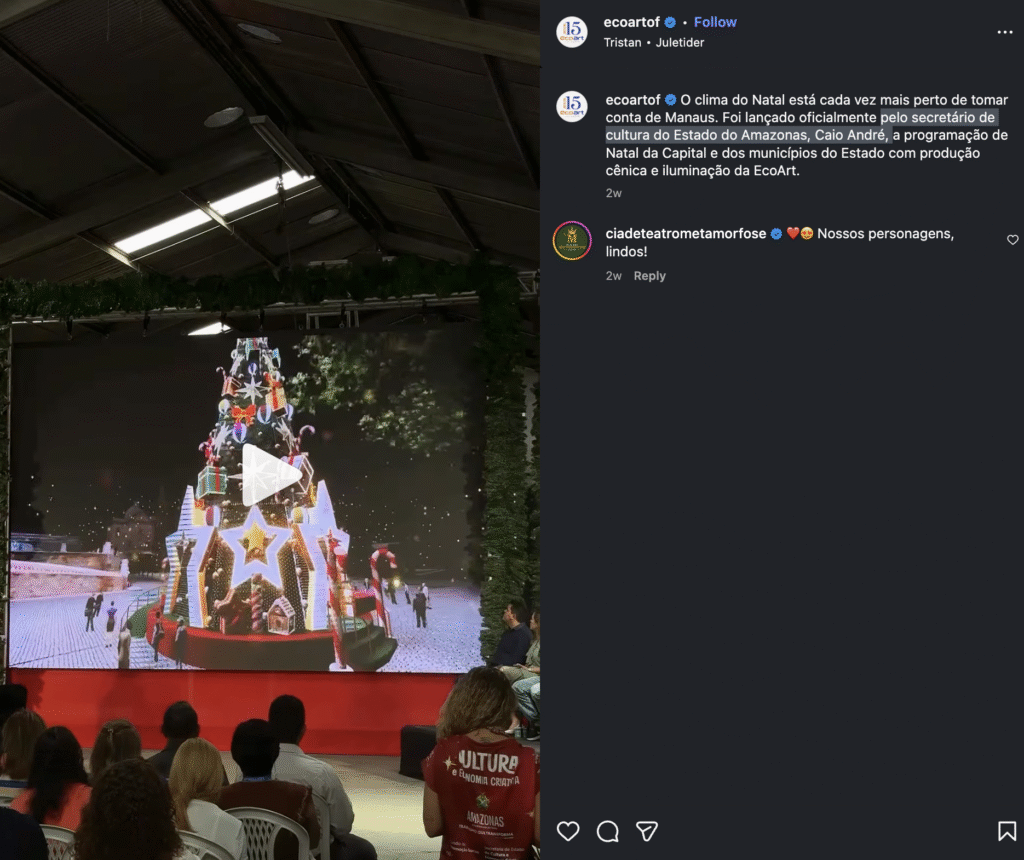 Nas redes sociais, internautas perceberam que tanto a Cenart quanto a Eco Art apagaram recentemente diversas publicações em que aparecem juntas na montagem da árvore de Natal e em outros trabalhos no Centro de Manaus. Apesar da tentativa de “limpar” os perfis, ainda restam registros de publicações que mencionam a Secretaria de Cultura do Amazonas neste ano de 2025 e também a montagem de 2024 — ano em que a árvore instalada no Largo pegou fogo, também sob responsabilidade das mesmas empresas.
