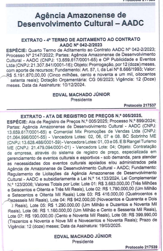 Amazonas – As empresas BC Sobrinho ME, Comercial Mix Promoções e Vendas Ltda e E. B. Rangel Turismo e Serviços Ltda seguem entre as mais beneficiadas por contratos públicos no Amazonas. Desta vez, elas foram novamente selecionadas pela Agência Amazonense de Desenvolvimento Cultural (AADC) para executar serviços de gerenciamento de eventos culturais, em um acordo que totaliza R$ 9.860.990,00, conforme a Ata de Registro de Preços nº 005/2025.
