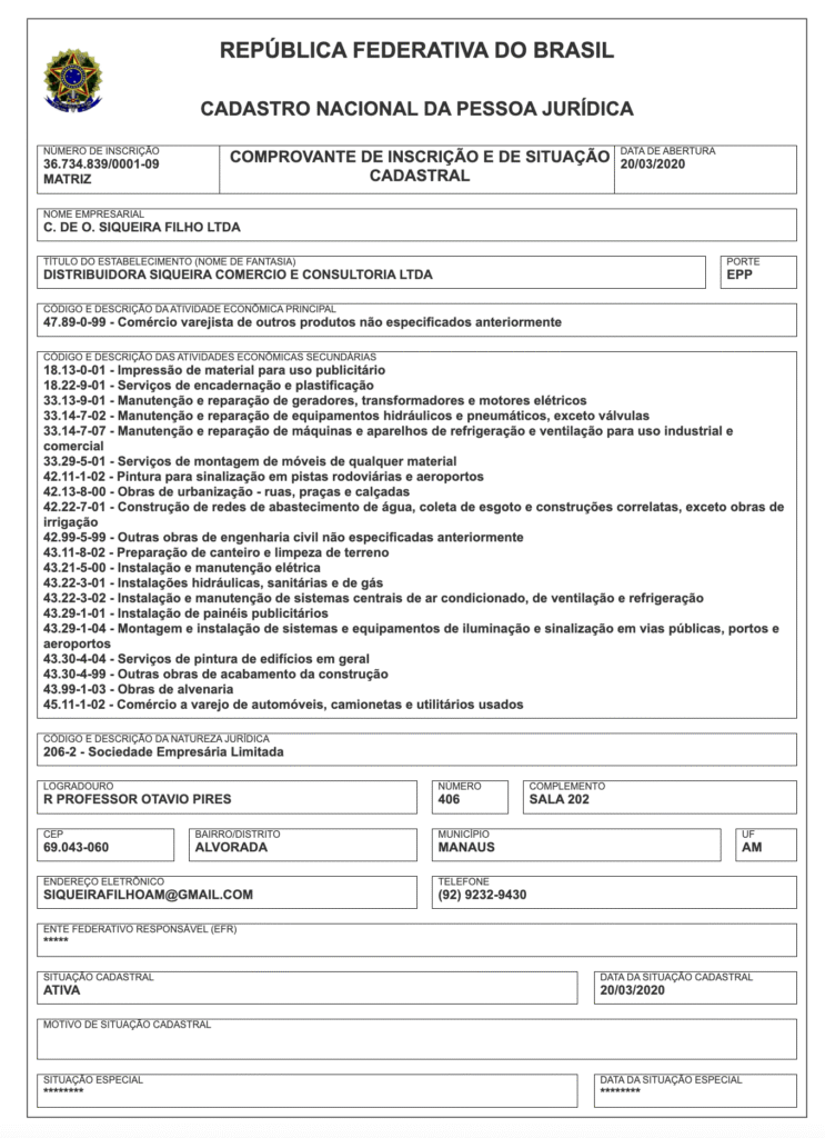 Oficialmente, a atividade principal é o comércio varejista de produtos não especificados, mas o documento mostra um portfólio curioso: impressão de material publicitário, encadernação e plastificação, representação comercial de medicamentos e cosméticos, comércio de cama, mesa e banho, bufê para eventos e até venda de doces e bombons.