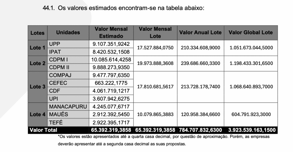 A análise minuciosa do edital expõe uma distorção grave no custo per capita. O valor mensal estimado para o contrato é de R$ 65,3 milhões. Considerando a capacidade operacional das unidades licitadas (aproximadamente 6.327 presos), o custo médio por detento no Amazonas será de R$ 10.335,00 por mês.