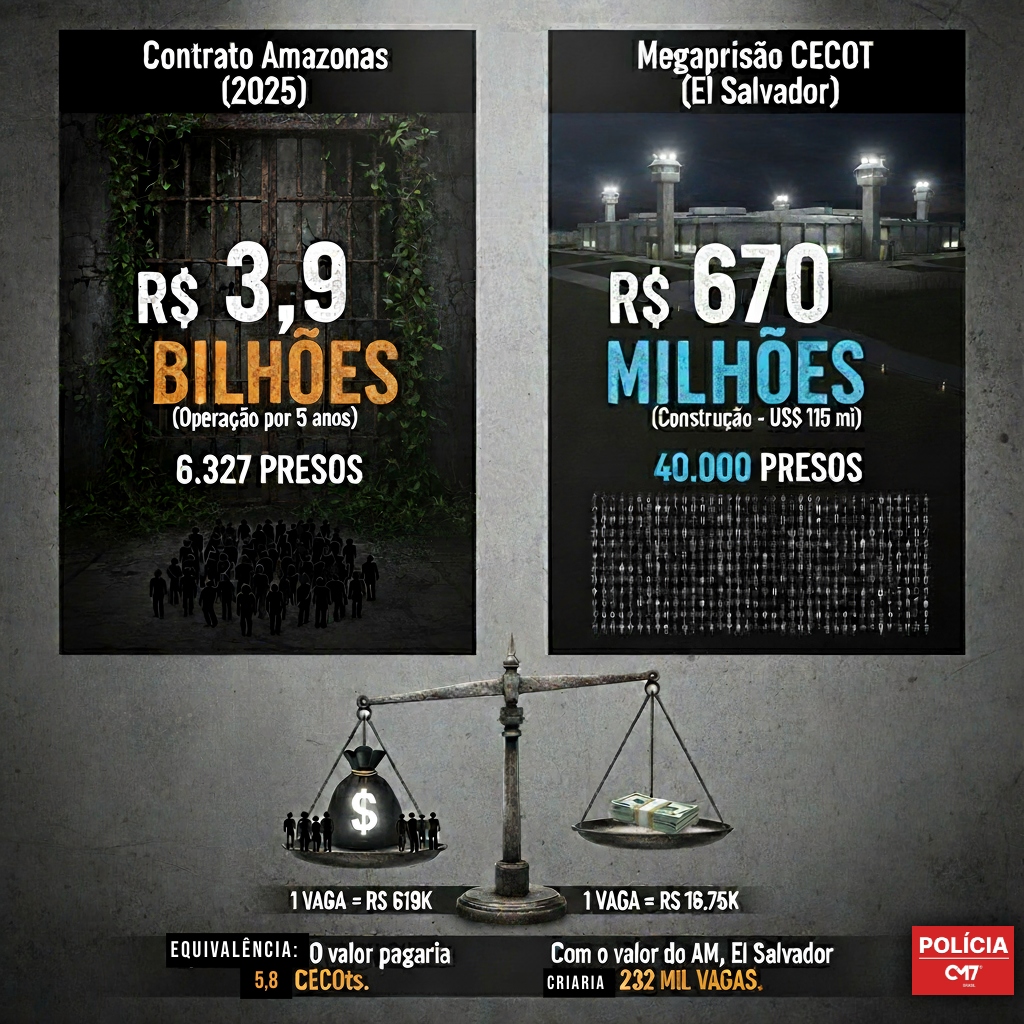 Em termos práticos: com o valor de apenas um ano do contrato amazonense, seria possível construir uma megaprisão de segurança máxima igual à de Nayib Bukele e ainda sobrariam cerca de R$ 114 milhões nos cofres públicos. Se considerarmos o valor global do contrato (5 anos), o montante seria suficiente para erguer 5,8 unidades do porte do CECOT.