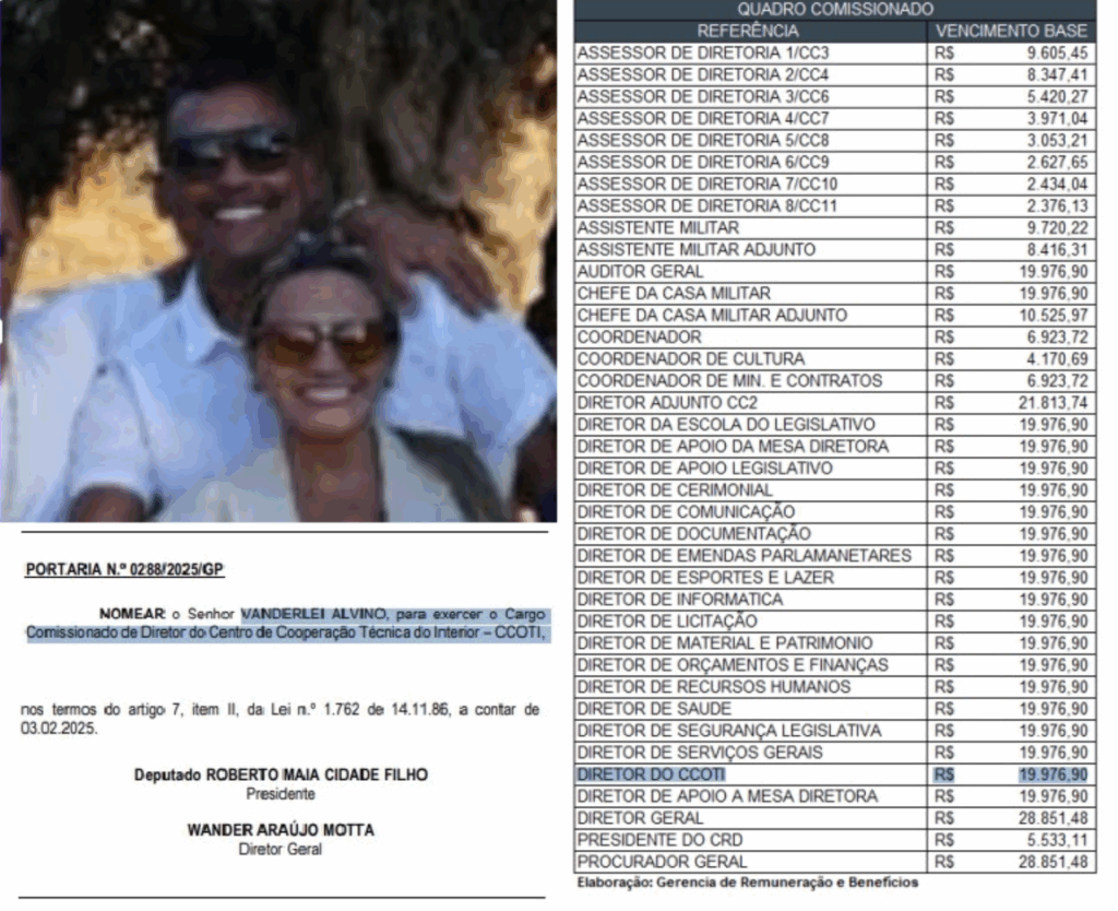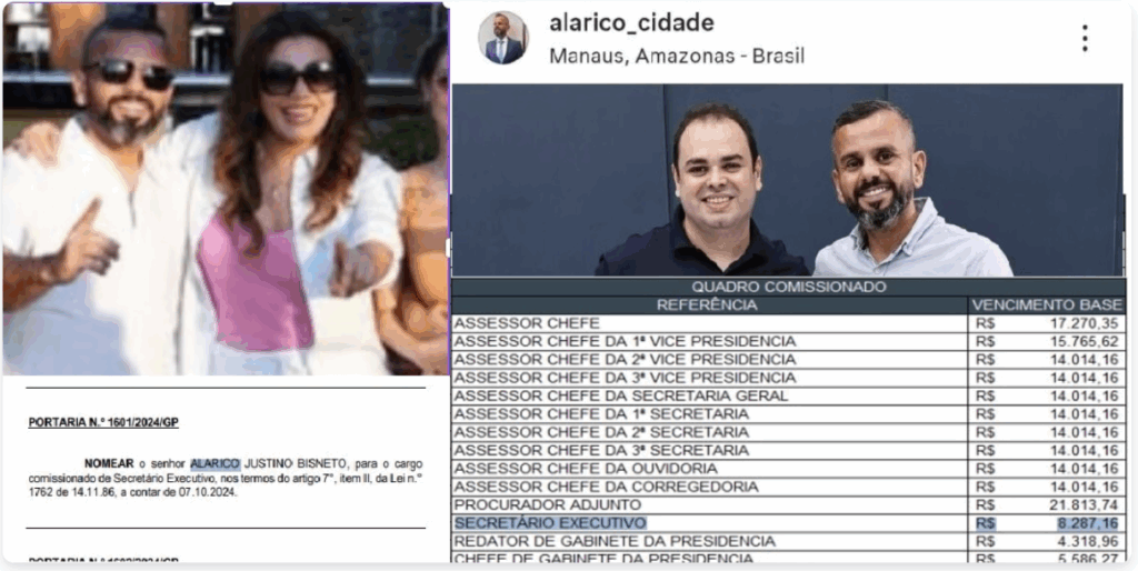 Segundo documentos oficiais da própria Assembleia, o cunhado de Roberto Cidade, Vanderlei Alvino (Vandex), marido de Adriana Cidade, exerce um cargo estratégico no órgão: é o atual Diretor do Centro de Cooperação Técnica e Operacional da Tecnologia da Informação (CCOTI), conforme a Portaria nº 0288/2025/GP. Seu salário bruto mensal é de R$ 19.976,90. Vandex é velho conhecido do meio político — já presidiu o Instituto de Desenvolvimento Agropecuário e Florestal Sustentável do Amazonas (IDAM), e chegou a ser citado em investigações da PF que apontaram a existência de um suposto “QG do Crime”, grupo suspeito de fraudes e tráfico de influência. Segundo denúncias, reuniões desse grupo teriam ocorrido na casa de Adriana Cidade.