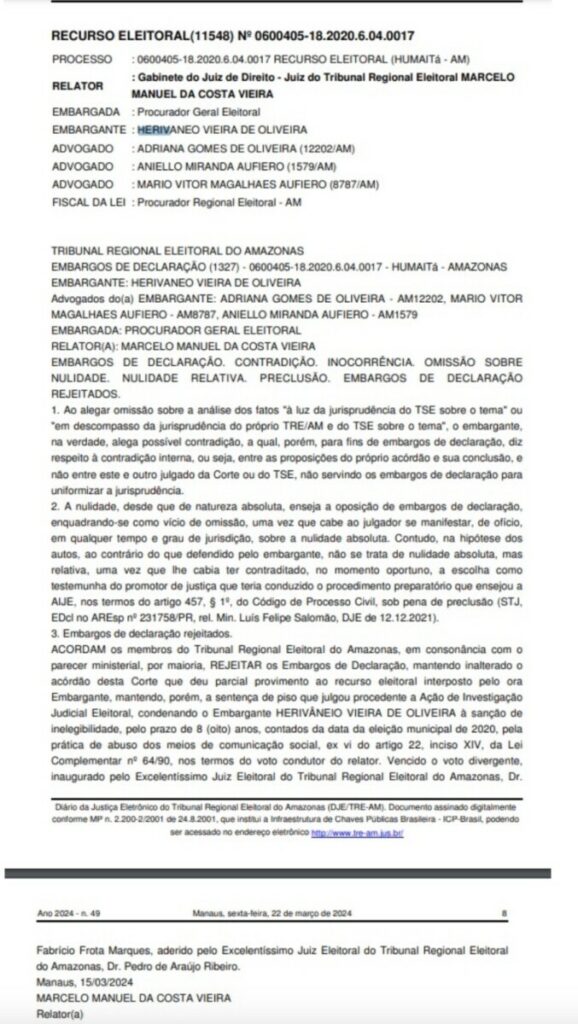 “Mantendo inalterado o acórdão desta Corte que deu parcial provimento ao recurso eleitoral interposto pelo ora embargante, mantendo, porém, a sentença de piso que julgou procedente a Ação de Investigação Judicial Eleitoral, condenando o embargante, Herivâneo Vieira de Oliveira, à sanção de inelegibilidade”, explica parte do documento.