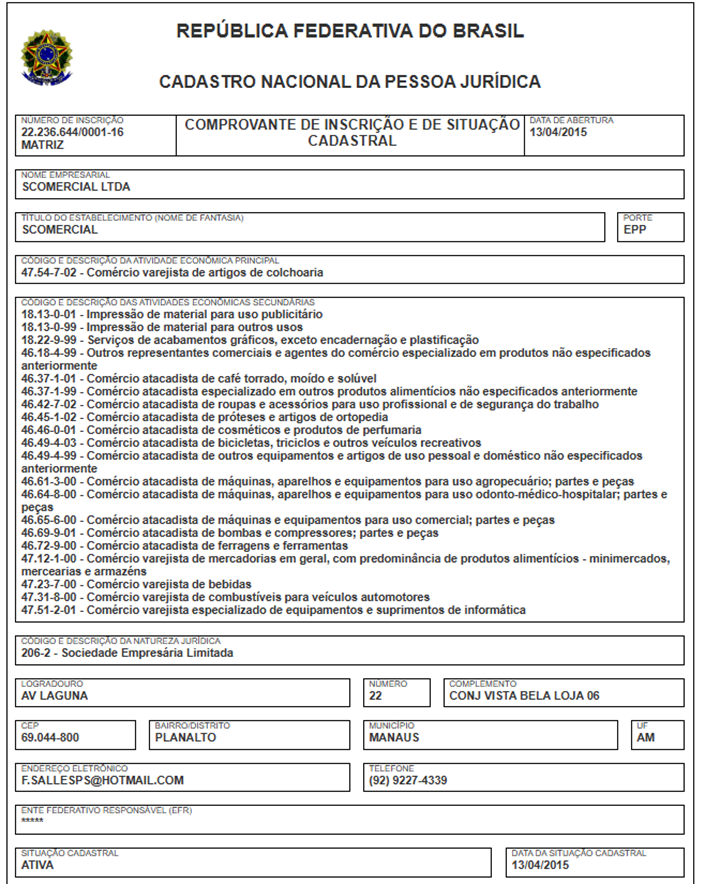 A empresa Scomercial LTDA (CNPJ: 22.236.644/0001-16) tem sede em Manaus, e está registrada para atuar principalmente no ramo de colchões e artigos domésticos.