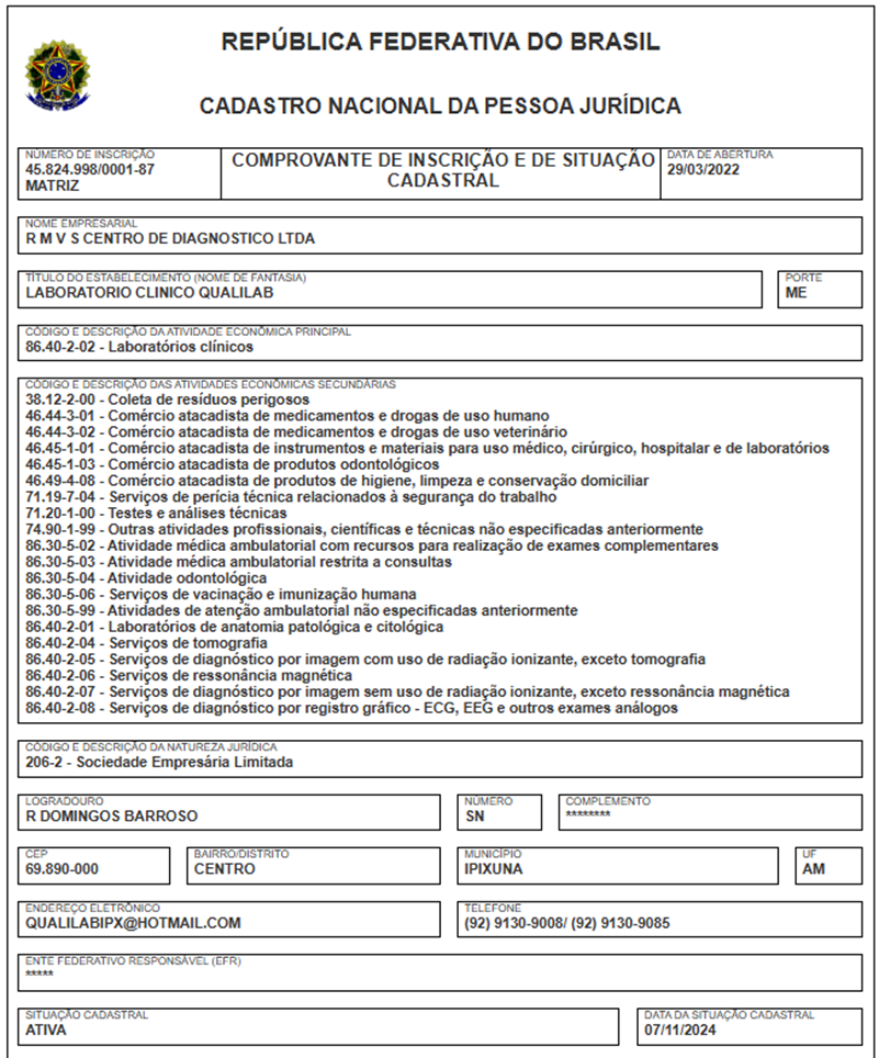 Mas não para por aí. O contrato ainda inclui a empresa R M V S Centro de Diagnóstico Ltda, que, apesar de atuar na área da saúde, está registrada como microempresa (ME), e por isso, legalmente limitada para firmar contratos de grande porte com o poder público.