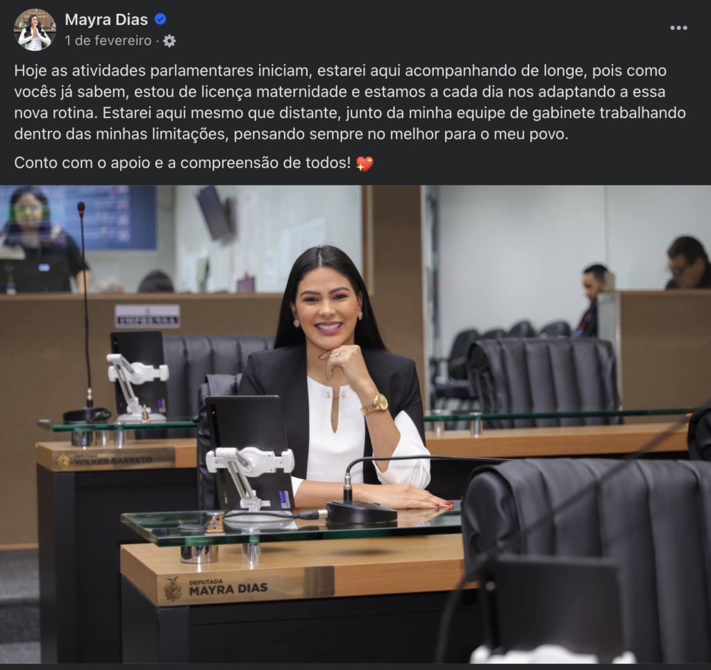 A Consolidação das Leis do Trabalho (CLT) garante às mulheres o direito à licença-maternidade para cuidar de seus recém-nascidos. Este período normalmente dura 120 dias, mas no Parlamento Estadual do Amazonas, pode ser estendido por mais 60 dias, totalizando 180 dias ou seis meses. Durante este período, a deputada Mayra Dias recebeu cerca de R$ 300 mil de salário da Aleam, mesmo não comparecendo ao parlamento.