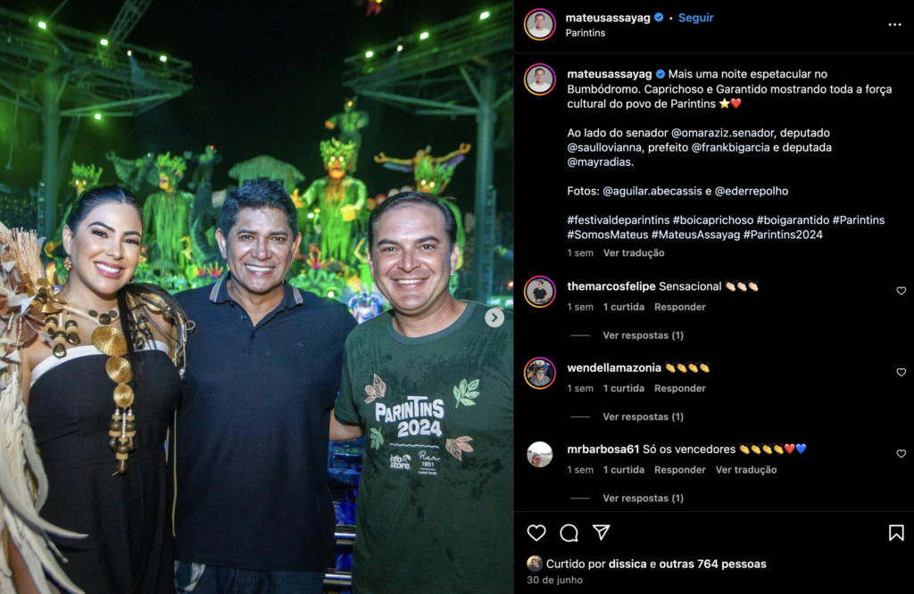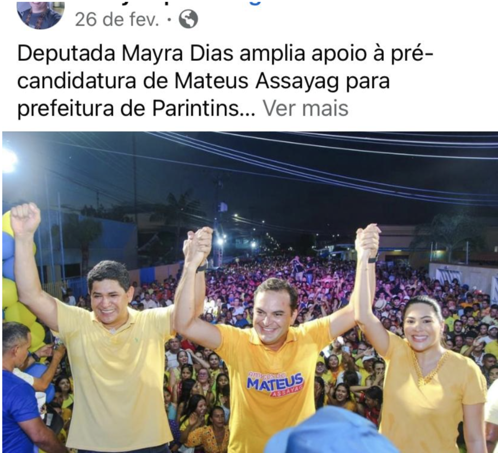 Além disso, mais recentemente, Mayra Dias esteve presente na ala VIP do Festival de Parintins nos dias 28, 29 e 30 de junho, onde foi vista em diversas fotos ao lado de Mateus Assayag, reforçando ainda mais seu apoio ao pré-candidato do marido.