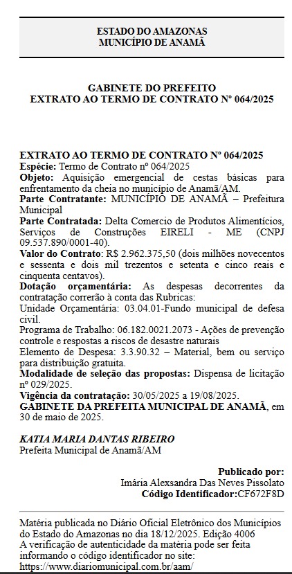Amazonas – Uma compra emergencial realizada pela Prefeitura de Anamã, no interior do Amazonas, passou a ser alvo de questionamentos e denúncia encaminhada ao Portal e TV CM7 Brasil, após a publicação de um extrato contratual no Diário Oficial dos Municípios do Estado.