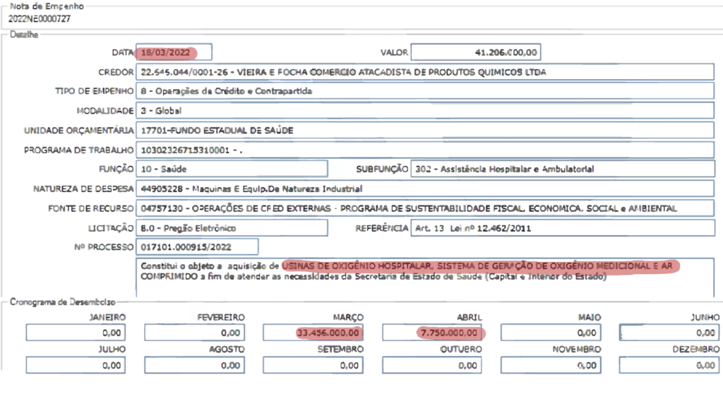Durante a crise da COVID-19, a SES-AM desembolsou exatos R$ 41.206.000,00 para a aquisição de 29 usinas de oxigênio da Vieira e Rocha Ltda, empresa que, segundo registros na Receita Federal, possui como atividade principal o comércio atacadista de produtos químicos e fornecimento de grandes equipamentos para a saúde. No entanto, os equipamentos adquiridos pela SES-AM geraram suspeitas, pois, segundo denúncias, muitas dessas usinas não funcionaram adequadamente, agravando a situação durante o colapso do sistema de saúde no estado.