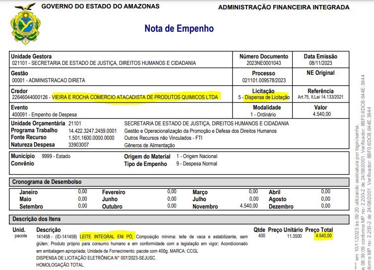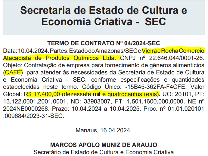 O contrato mais expressivo foi com a SEC-AM, no valor de R$ 17.400,00, para fornecer mil pacotes de café torrado e moído, conforme publicado no Diário Oficial em abril deste ano. Além disso, a empresa também forneceu ovos de galinha à FVS-RCP por R$ 6.249,10 e leite integral em pó para a SEJUSC por R$ 4.540,00, este último através de uma “dispensa de licitação”.