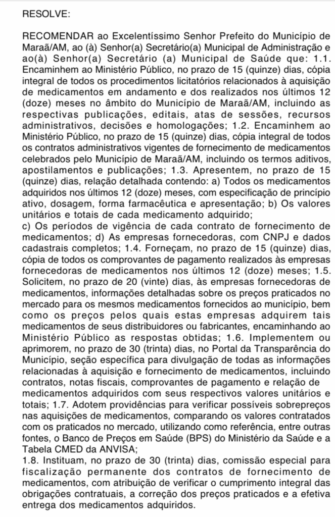 O promotor de Justiça Marcos Túlio Pereira Correia Júnior determinou que, em até 15 dias, a gestão municipal apresente todos os documentos relacionados às licitações, notas fiscais, contratos e relatórios de pagamentos. Também foi solicitado que o Portal da Transparência de Maraã seja atualizado com informações detalhadas sobre fornecedores e despesas, ampliando a visibilidade para a população.